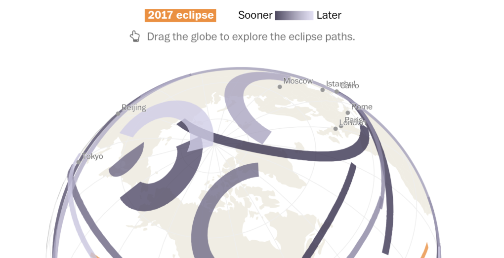 Denise Lu, over at the Washington Post, has crafted an absolute stellar (pun not intended- but I’m going to fully own it) story of all things elclipse-related. Her tight visualizations and commentary make for an extremely interesting article. I love the simplicity and the colors used – makes some pretty intense data very easy to understand.