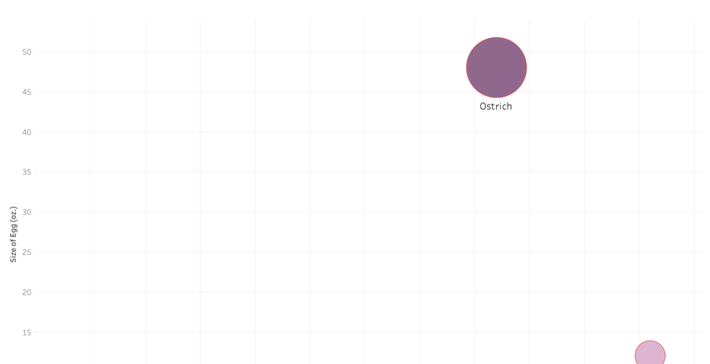 To celebrate, Brinkley scoured the internet for some egg-related data and built this eggcellent visualization – gestation period versus bird egg size. That teeny-tiny egg, that’s a quail egg. There was a nice, linear relationship between egg size and gestation period until the emu threw it off.