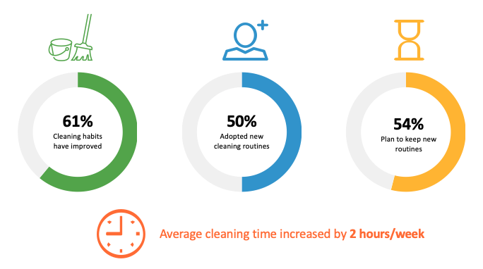 Perhaps one audience who might not be so thrilled about these changes is children. 44% of parents participating in the survey reported that their kids are helping to clean more than before the pandemic began, and 71% expect their kids to continue their new cleaning routines after the pandemic ends.