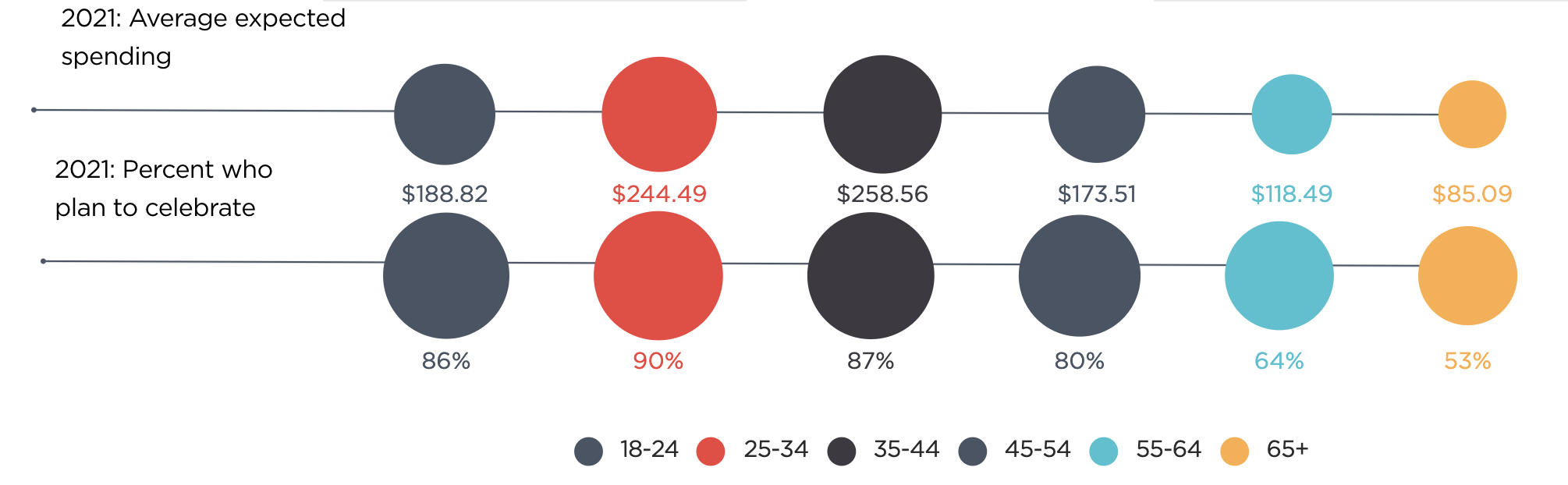 One thing I thought was particularly interesting is that men are more likely to be celebrating and on average are planning on spending more money on Father’s Day this year than women. Another aspect that factors into who is celebrating and how much they’ll be spending is age: younger people are planning on spending more on the holiday and are more likely to celebrate. This closely mirrors the data that we saw from the Mother’s Day survey. Take a look at the chart below to see the data broken down by age groups.
